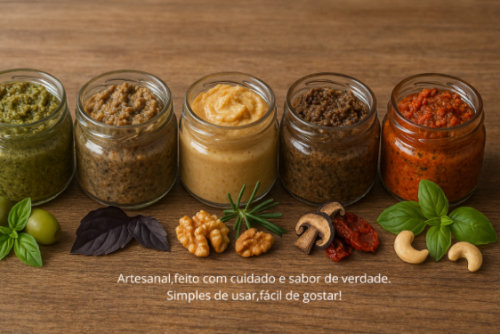Patês e temperos desidratados artesanais, feitos com ingredientes cuidadosamente escolhidos, pensados para o dia a dia, com sabor, tradição e cuidado em cada receita. Sabores que nascem da tradição e acompanham o seu dia a dia.